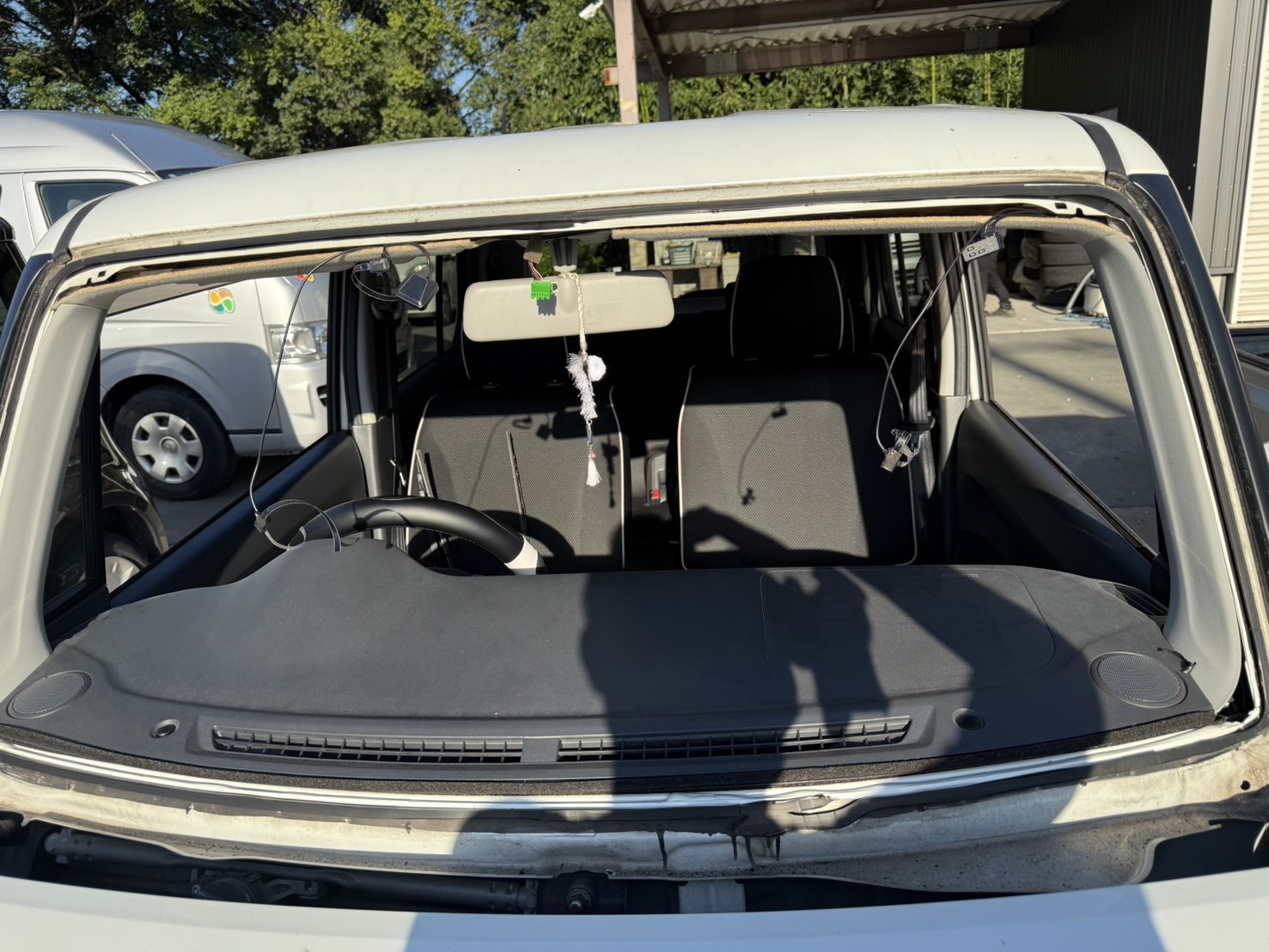 周囲のボディや内装を保護しながら、既存ガラスを慎重に取り外し、残留接着剤やゴミを丁寧に除去し、取り付け面を清掃しました。