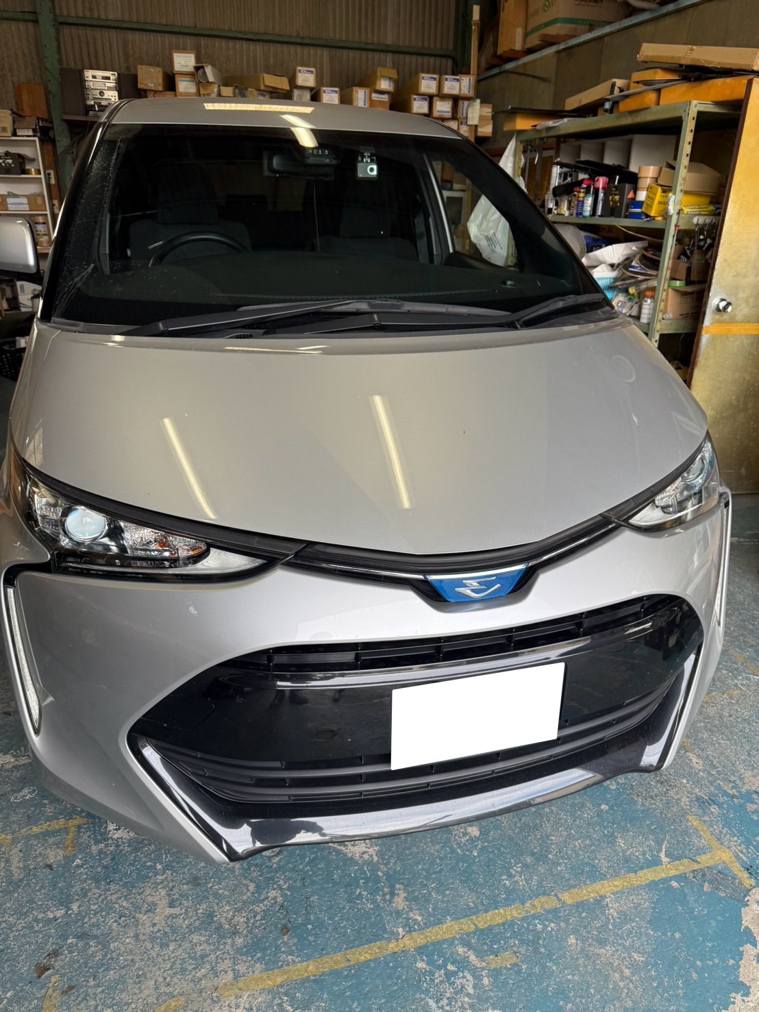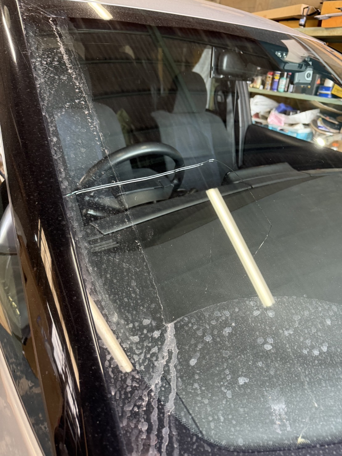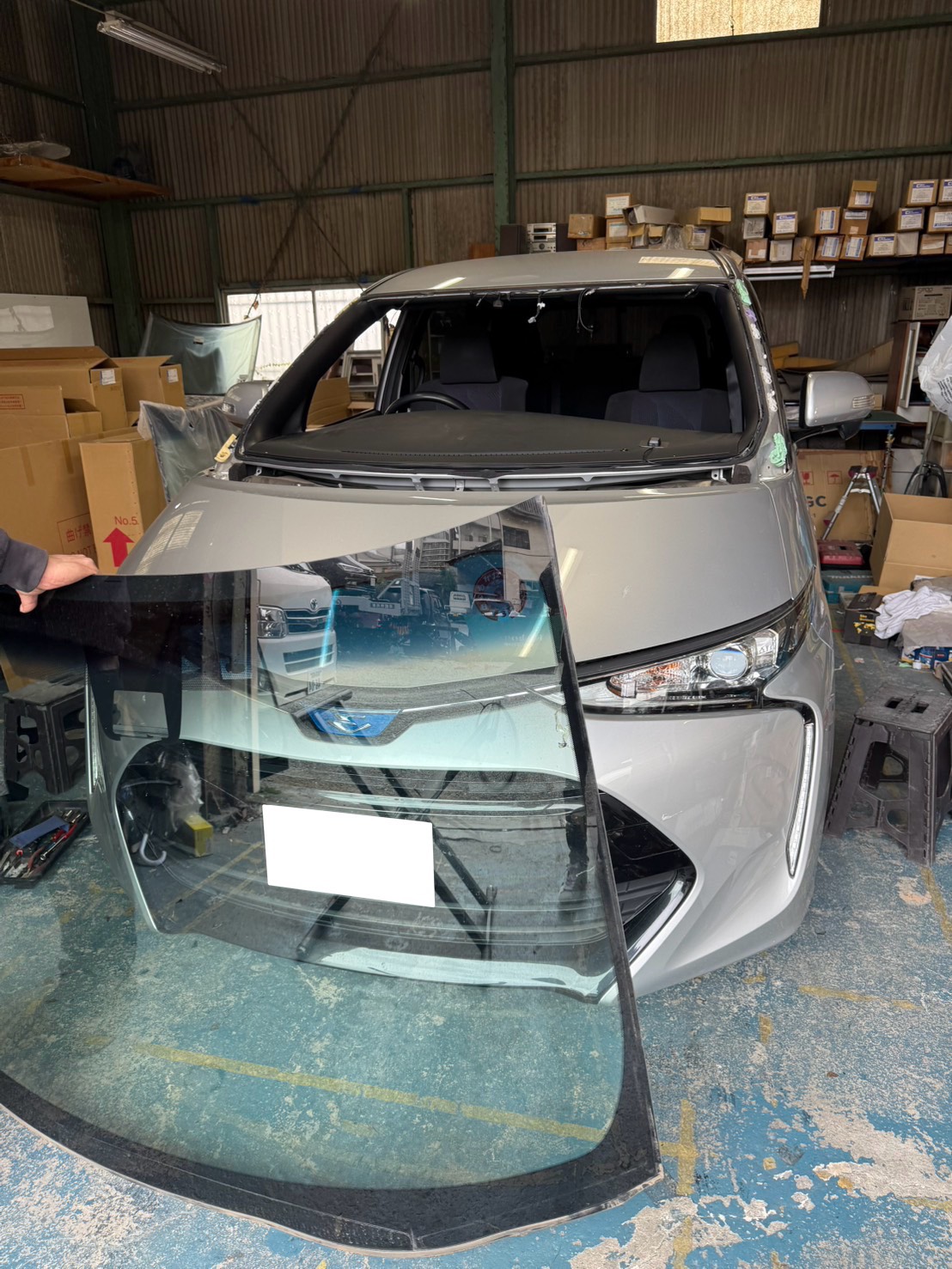 エスティマは自動ブレーキ用のカメラがフロントガラスに装着されているため、交換が必要な状態でした。