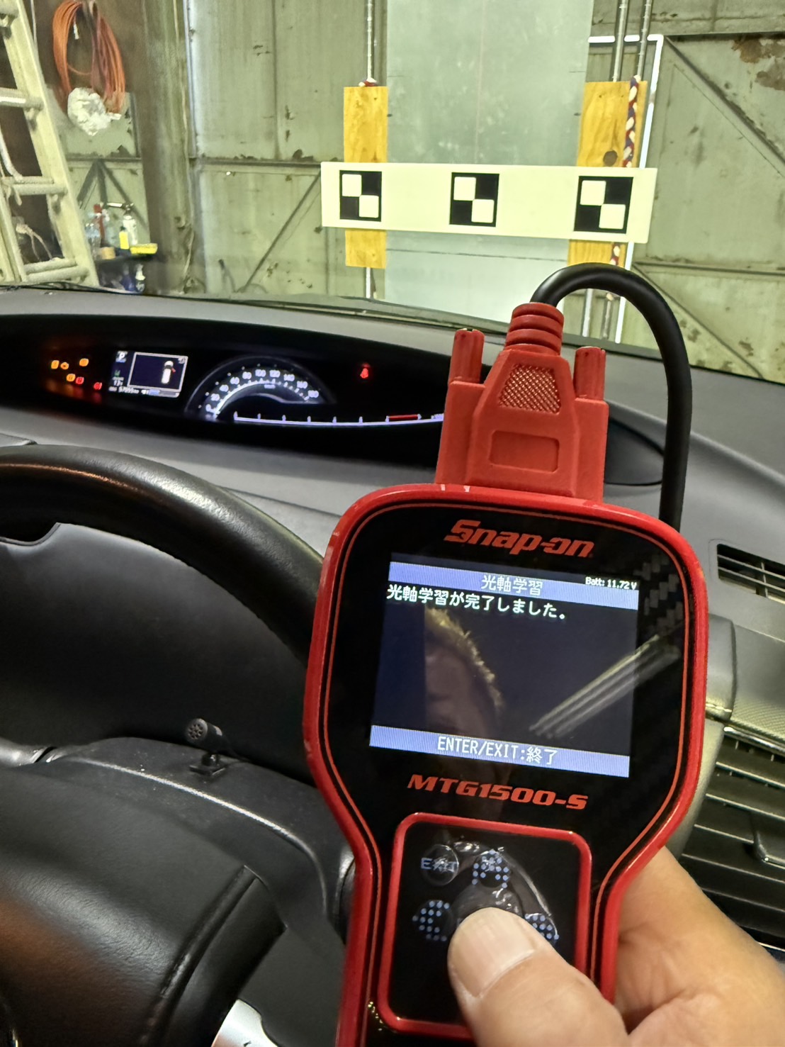 交換後は安全運転支援システムが正しく作動するよう、専用機器を用いてエーミング(カメラの校正)を実施。